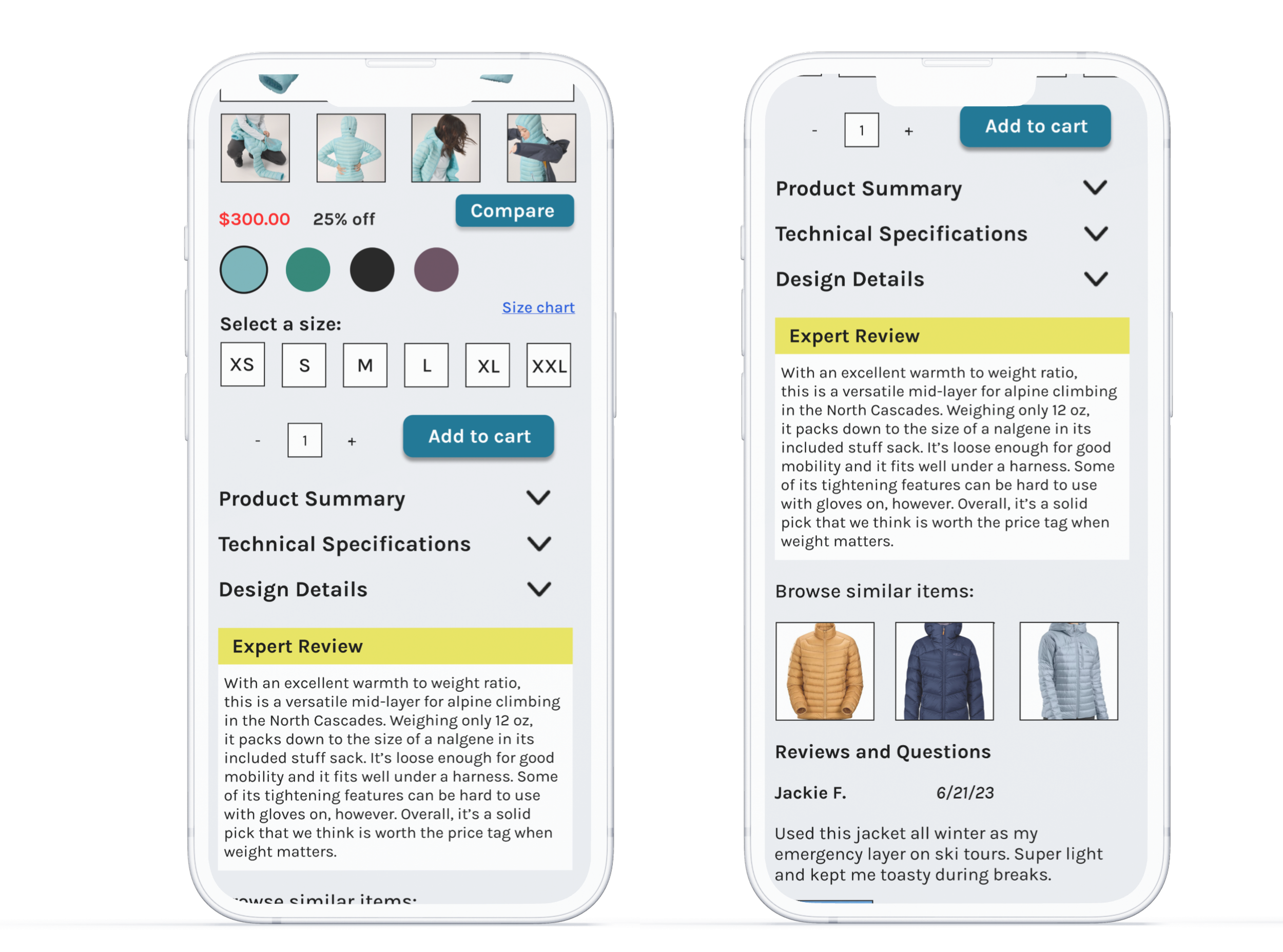 Product pages tend to be text heavy, which can feel tiring and overwhelming for the user. The accordion keeps pertinent details organized and accessible. The design details tab highlights what makes a product unique, helping further distinguish it.